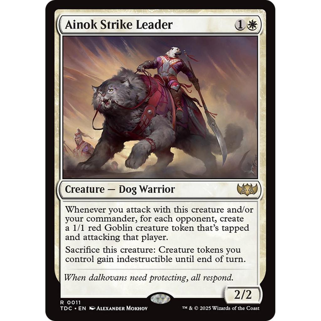 PredhWhenever you attack with this creature and/or your commander, for each opponent, create a 1/1 red Goblin creature token that's tapped and attacking that player.