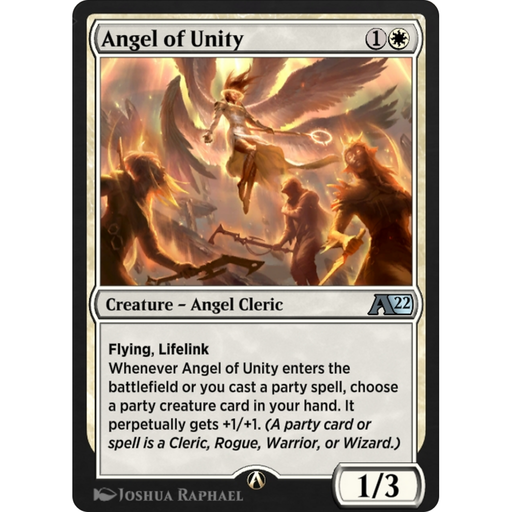 Whenever Angel of Unity enters the battlefield or you cast a party spell, choose a party creature card in your hand. It perpetually gets +1/+1. (A party card or spell is a Cleric, Rogue, Warrior, or Wizard.)