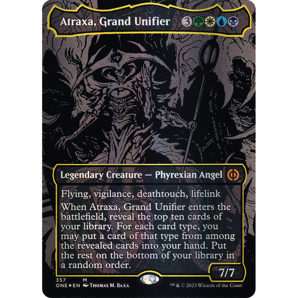 When Atraxa enters, reveal the top ten cards of your library. For each card type, you may put a card of that type from among the revealed cards into your hand. Put the rest on the bottom of your library in a random order. (Artifact, battle, creature, enchantment, instant, land, planeswalker, and sorcery are card types.)