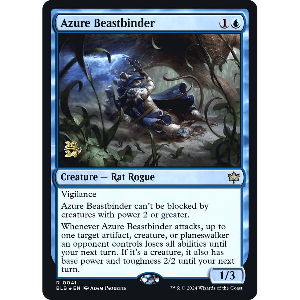 Whenever Azure Beastbinder attacks, up to one target artifact, creature, or planeswalker an opponent controls loses all abilities until your next turn. If it's a creature, it also has base power and toughness 2/2 until your next turn.