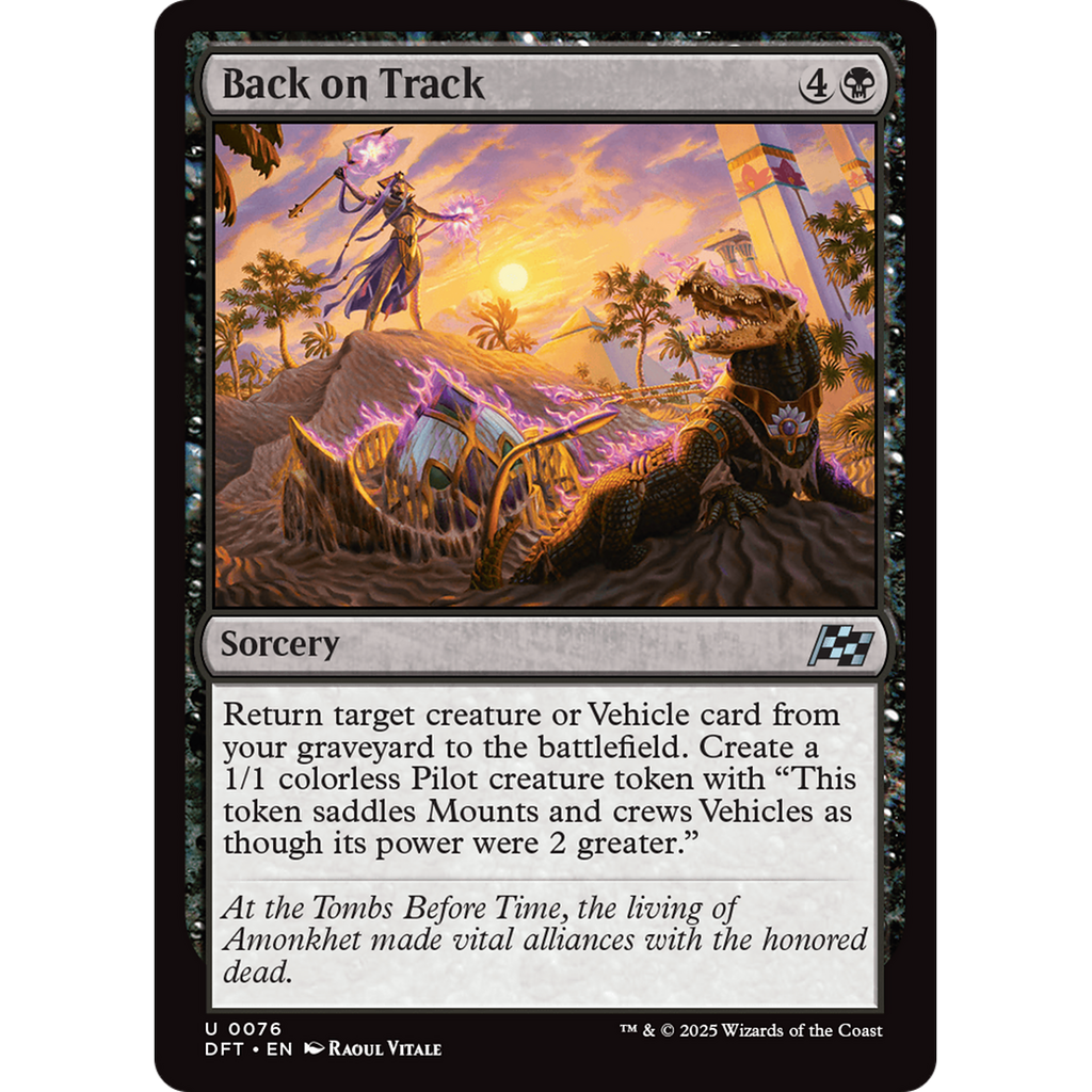 Return target creature or Vehicle card from your graveyard to the battlefield. Create a 1/1 colorless Pilot creature token with "This token saddles Mounts and crews Vehicles as though its power were 2 greater."
