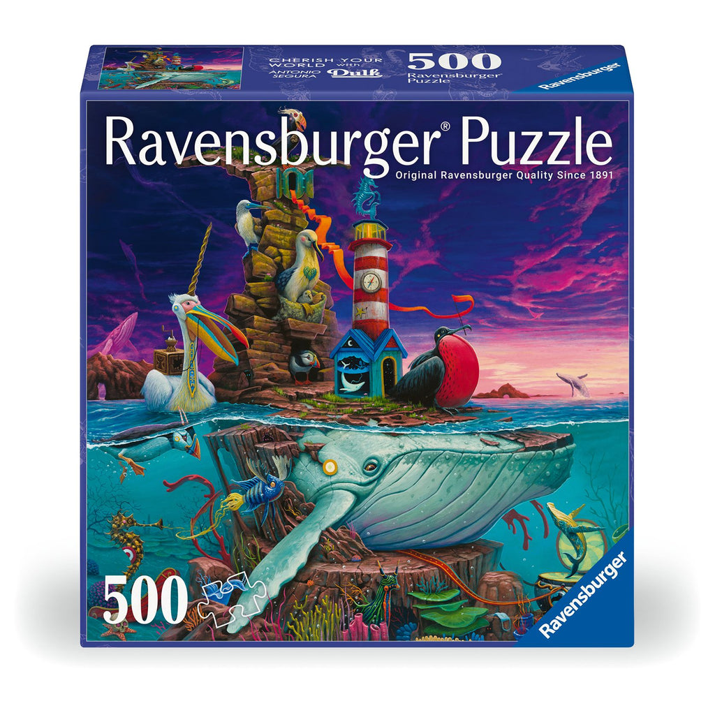 Our “Archipelago” puzzle highlights the plight of some of the ocean’s most unique creatures! An incredibly rare albino humpback whale is being transformed into part of the archipelago, creating a place of refuge for all the birds and marine species. The souls of lost animals fly in the sky. Part of our “Cherish Your World” series, the artist Dulk includes small targets in his surreal works to emphasize the fragility of, and threat to, nature with hope of inspiring us to protect our planet!
