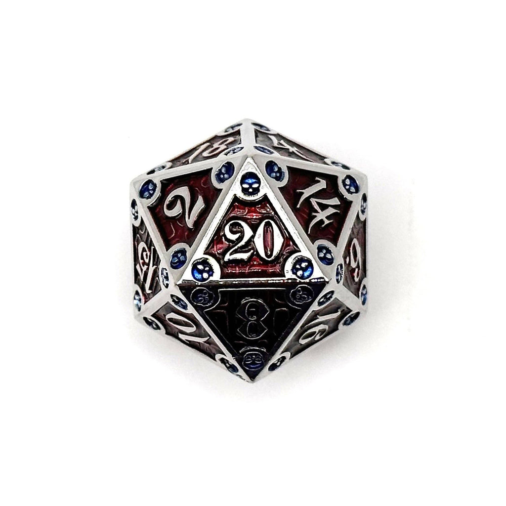 An Adventure Awaits. The skies seem darker than ever, trees start to wither, there’s just a general sense of eeriness all around. There’s just one possible explanation for this: Vampiric Corruption. When these undead creatures of the night infiltrate the land of the living, they subtly but surely infuse their vile energy into the air. As they derive energy for dark magic and blood for sustenance from the living, foul energies accumulate and the land itself becomes blighted and accursed. Embodying the cold, vile spirit of the Vampires, this die is designed in a striking combination of red and silver and is accented with blue skulls at the corners.