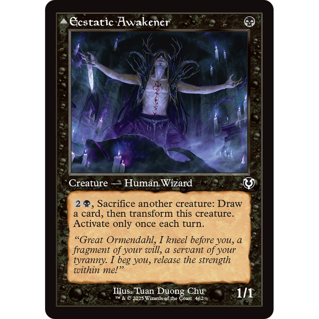 , Sacrifice another creature: Draw a card, then transform Ecstatic Awakener. Activate only once each turn.