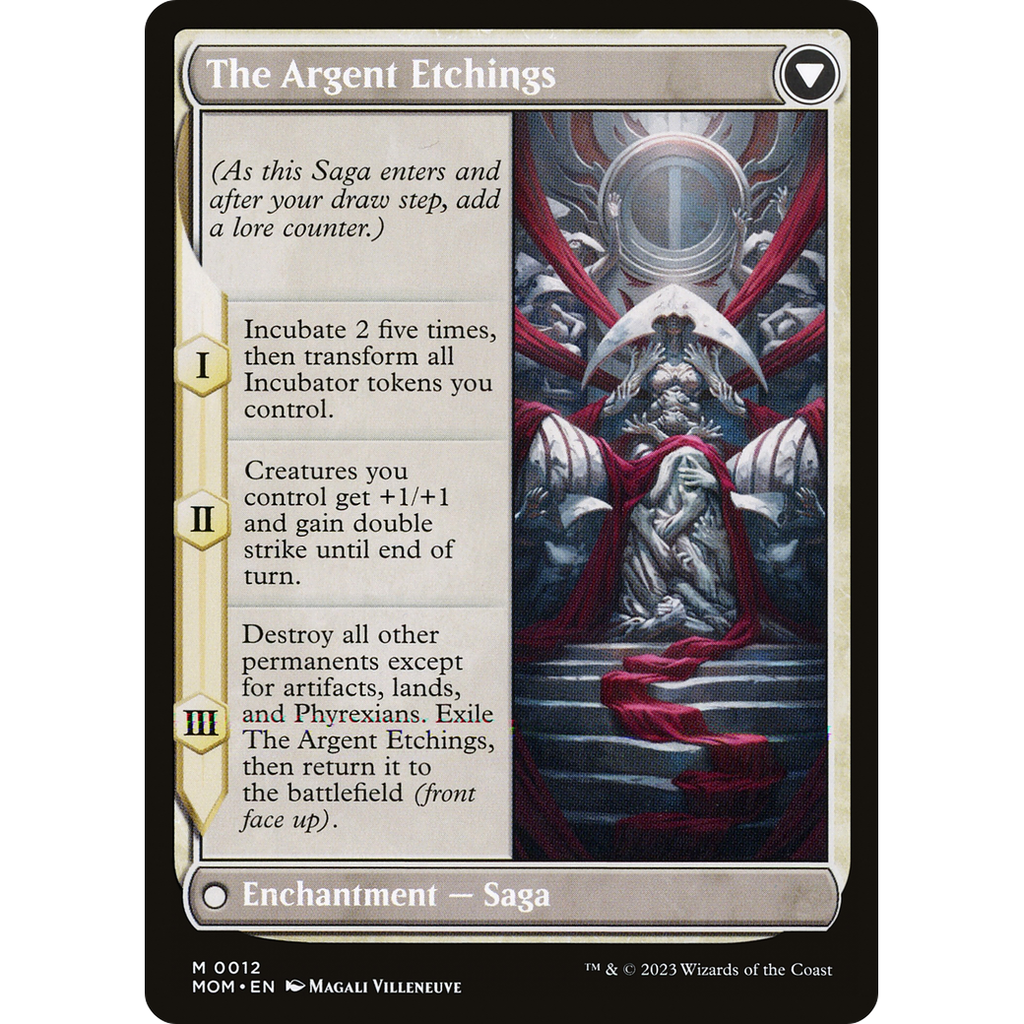 [III] Destroy all other permanents except for artifacts, lands, and Phyrexians. Exile The Argent Etchings, then return it to the battlefield (front face up).