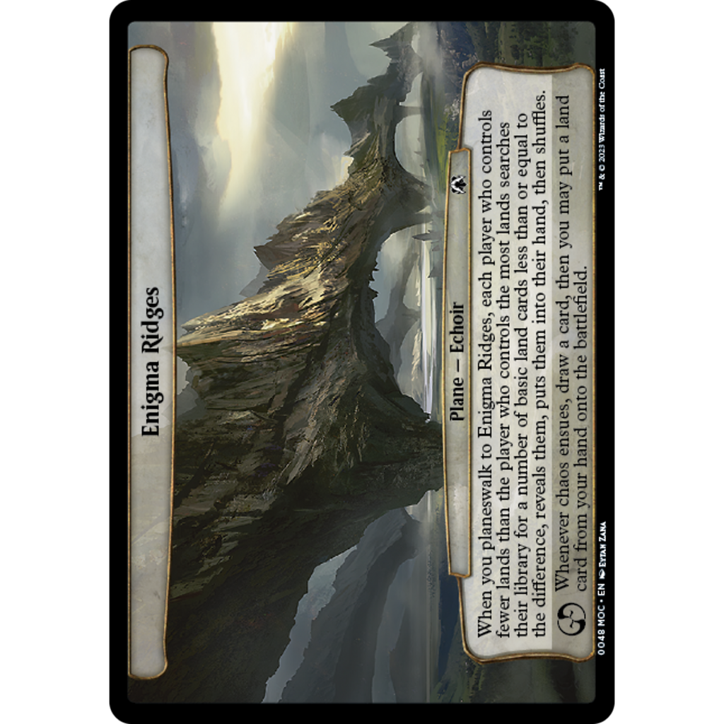 PredhWhen you planeswalk to Enigma Ridges, each player who controls fewer lands than the player who controls the most lands searches their library for a number of basic land cards less than or equal to the difference, reveals them, puts them into their hand, then shuffles.