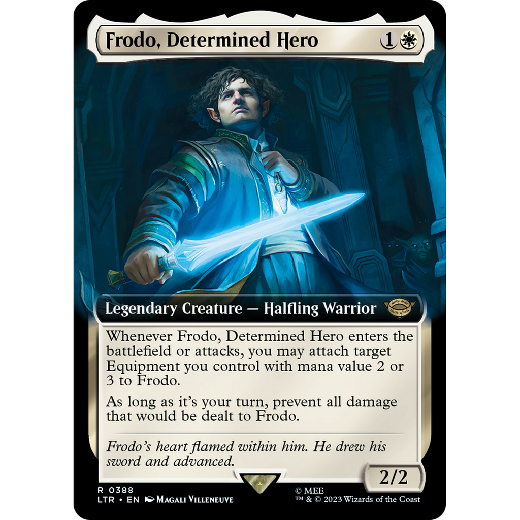 PredhWhenever Frodo enters or attacks, you may attach target Equipment you control with mana value 2 or 3 to Frodo.