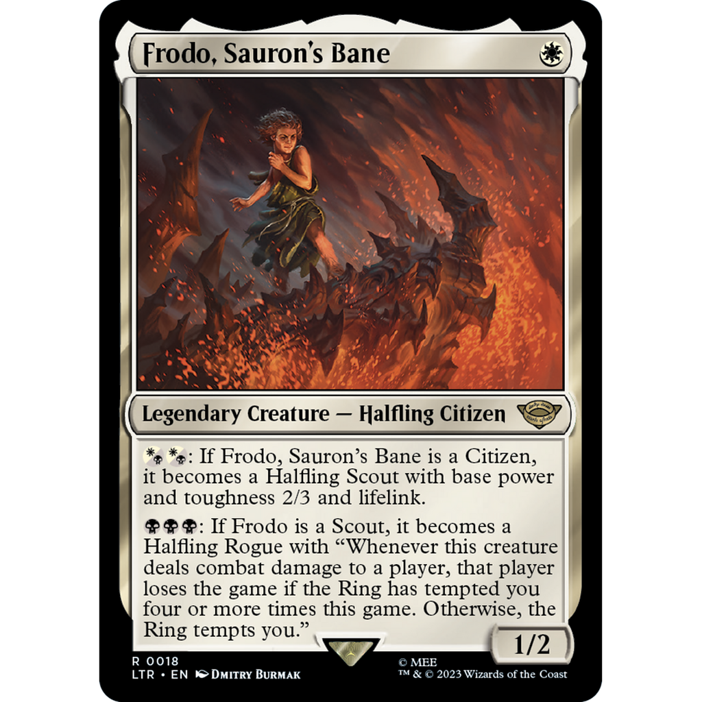 : If Frodo is a Scout, it becomes a Halfling Rogue with "Whenever this creature deals combat damage to a player, that player loses the game if the Ring has tempted you four or more times this game. Otherwise, the Ring tempts you."