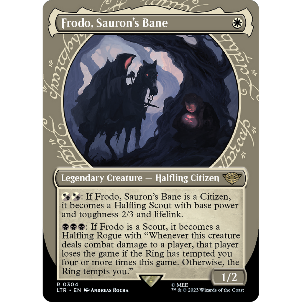 : If Frodo is a Scout, it becomes a Halfling Rogue with "Whenever this creature deals combat damage to a player, that player loses the game if the Ring has tempted you four or more times this game. Otherwise, the Ring tempts you."