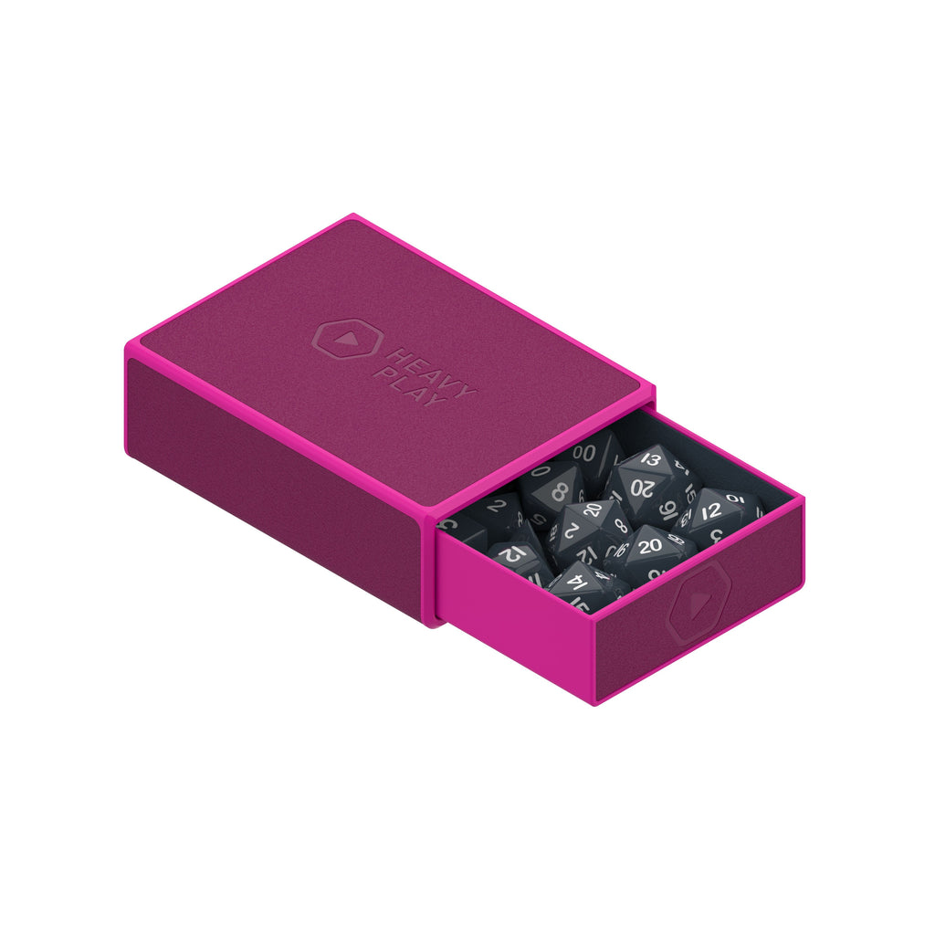 The ultimate dice box. Fits 4x D20 spindowns, a full set of 7x RPG dice, and a bunch of extra D6's or tokens. Magnetic tray slides out and pops on top for easy dice access during gameplay. Durable vegan leather exterior. Soft microfiber lining to dampen rattling.