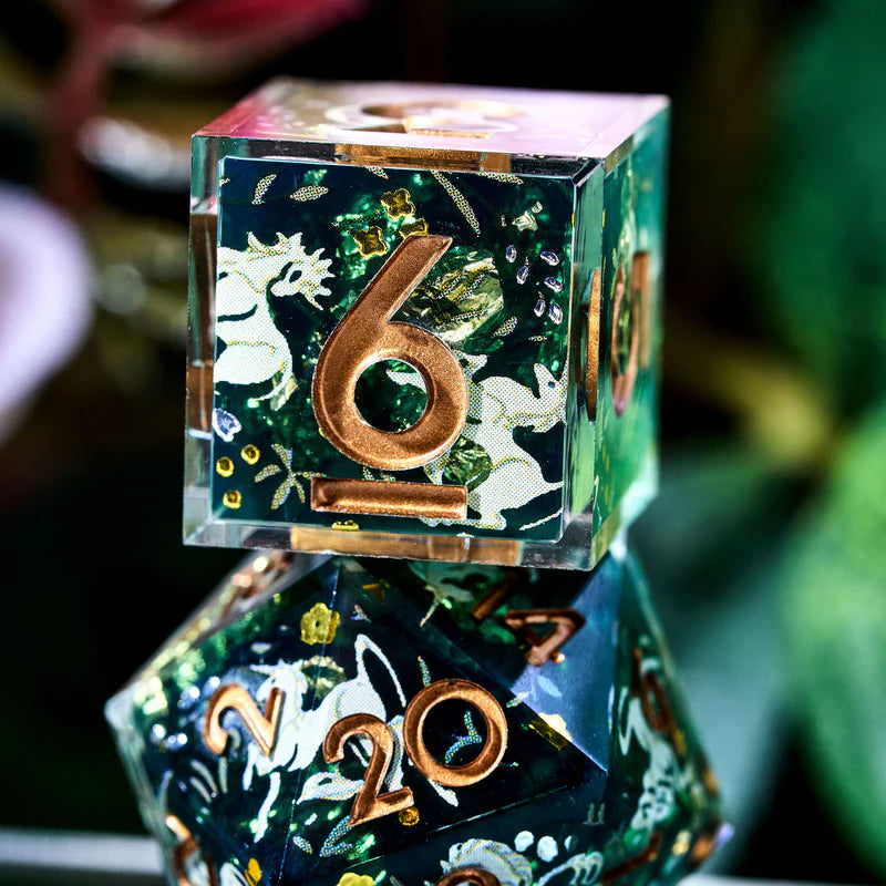 - Materials & Inclusions: Transparent exterior shell, deep green resin core with iridescent glimmer and gold foil, Hunt of the Unicorn inspired illustrations, metallic bronze numbers.