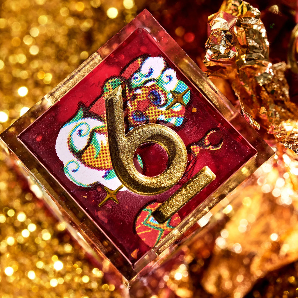 - Materials & Inclusions: Clear resin shell, translucent red base, CMYK illustrations of Fu Dogs or Stone Lions, metallic gold numbering.