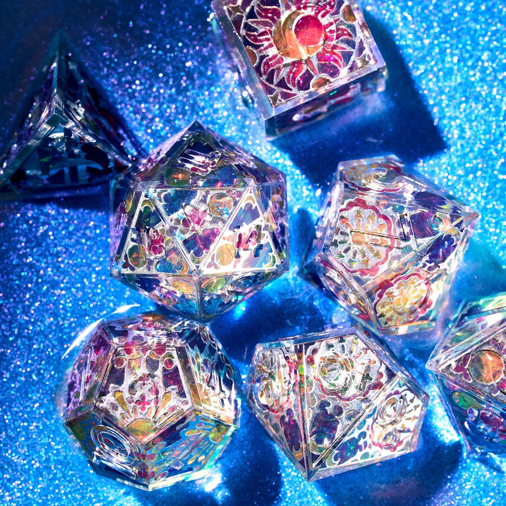 - Materials & Inclusions: Clear resin shell, stained glass like illustrations, silver-inked numbers.