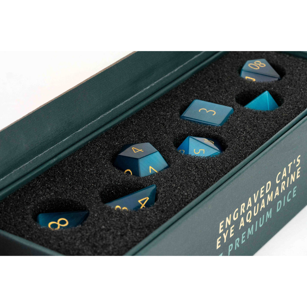 Mystic Mines: Engraved Cat's Eye Aquamarine Gemstone Poly Dice Set