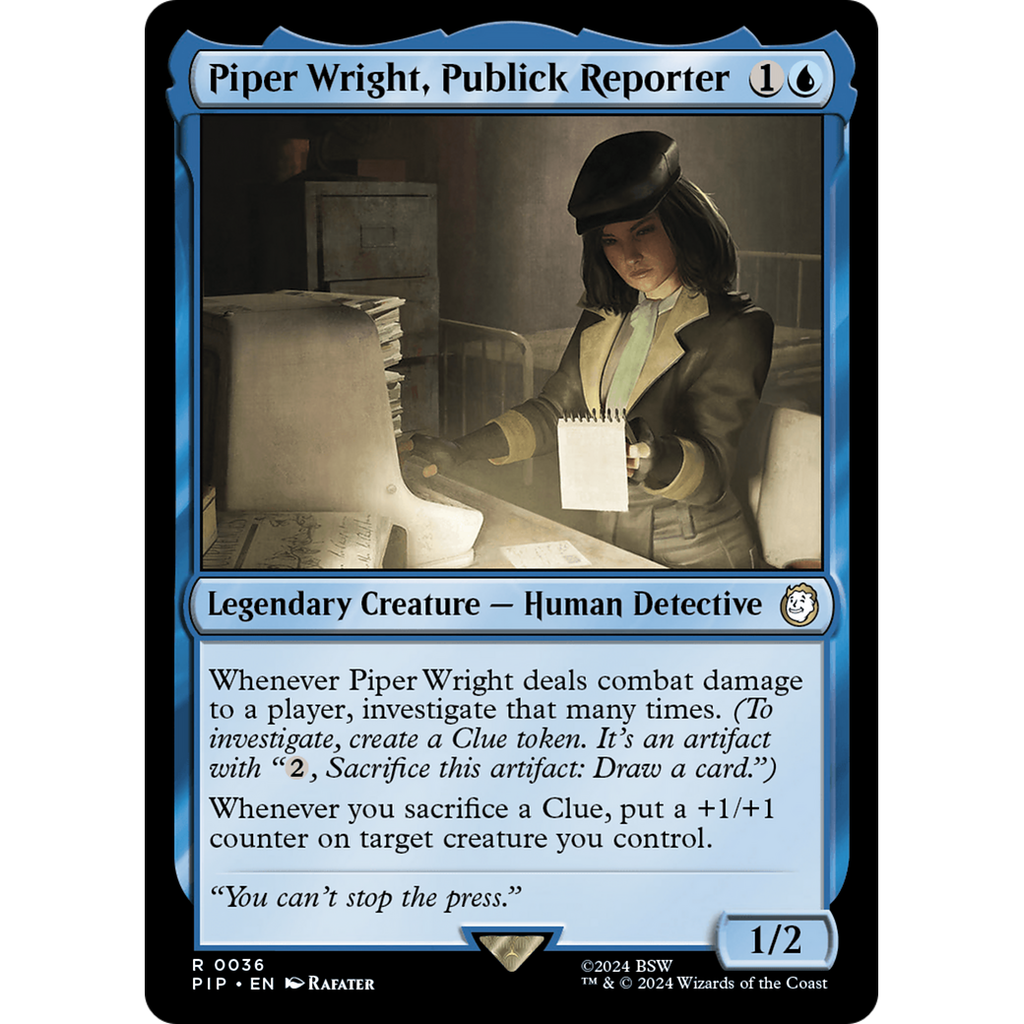 Whenever Piper Wright deals combat damage to a player, investigate that many times. (To investigate, create a Clue token. It's an artifact with ", Sacrifice this token: Draw a card.")