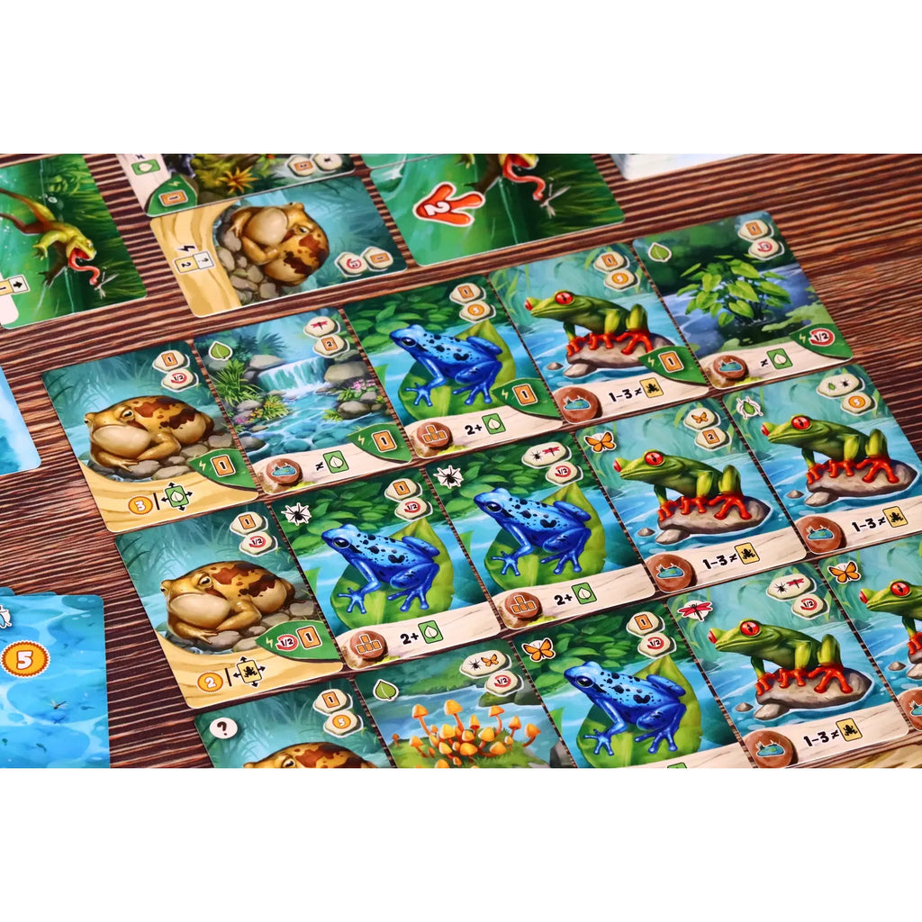 The core mechanisms involve grid building and card management, with pond construction as a spatial puzzle. In each round, players choose cards from a shared display and add one card to their pond, aiming to fulfill specific conditions set by different frog species to earn points, with larger groups of the same frog type yielding even greater rewards.