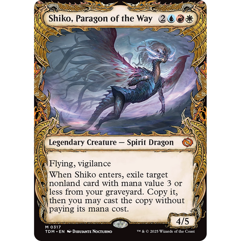 When Shiko enters, exile target nonland card with mana value 3 or less from your graveyard. Copy it, then you may cast the copy without paying its mana cost. (A copy of a permanent spell becomes a token.)