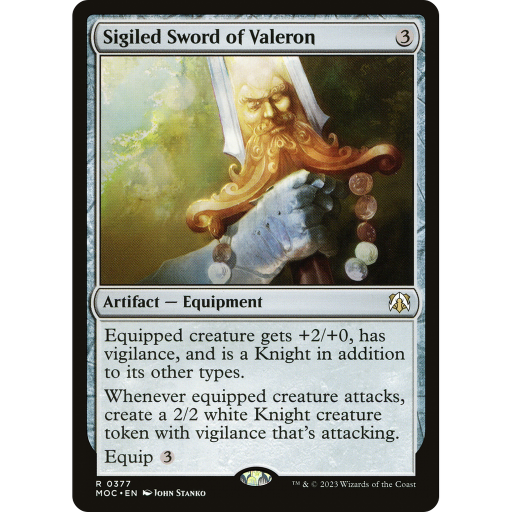 Whenever equipped creature attacks, create a 2/2 white Knight creature token with vigilance that's attacking.