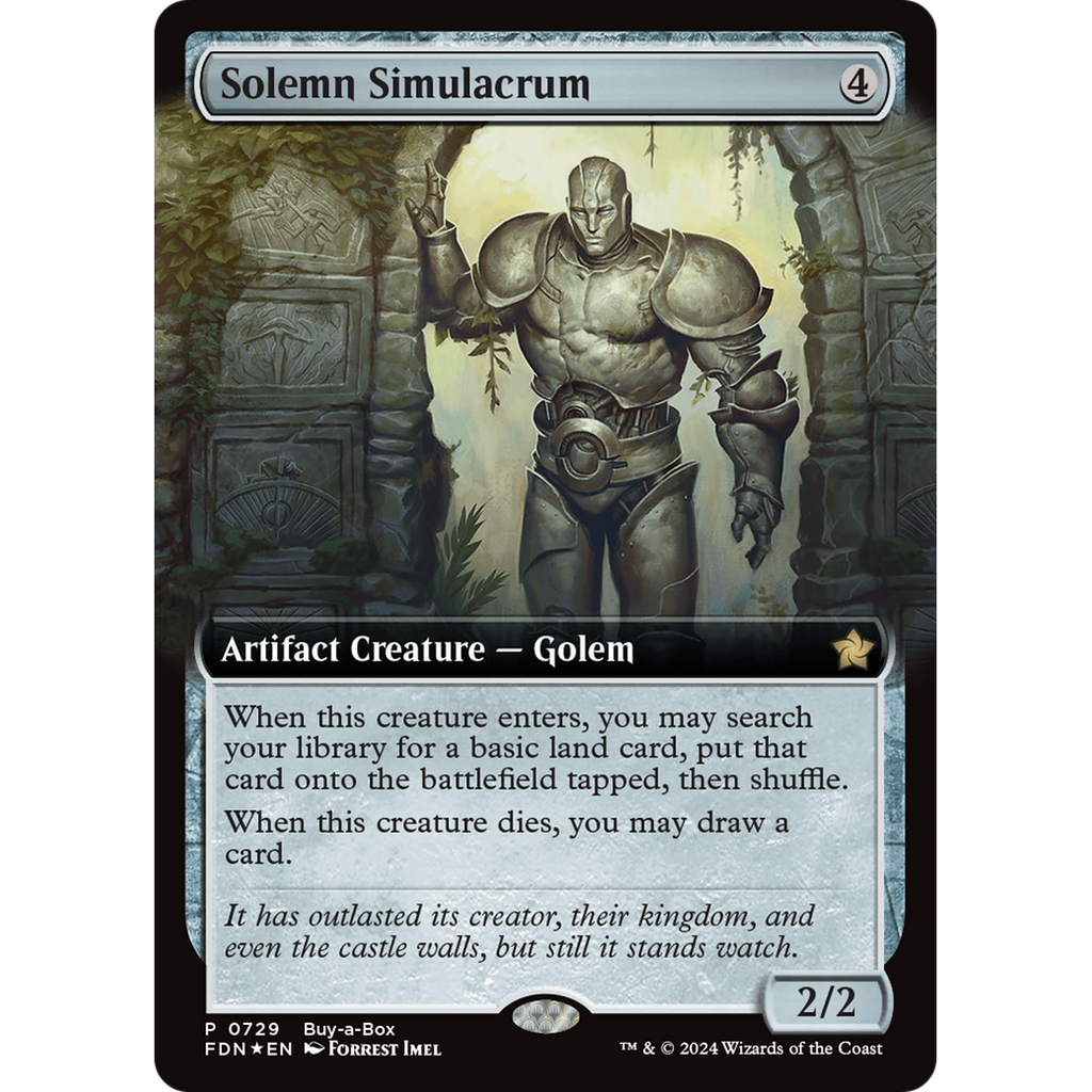 PredhWhen Solemn Simulacrum enters, you may search your library for a basic land card, put that card onto the battlefield tapped, then shuffle.