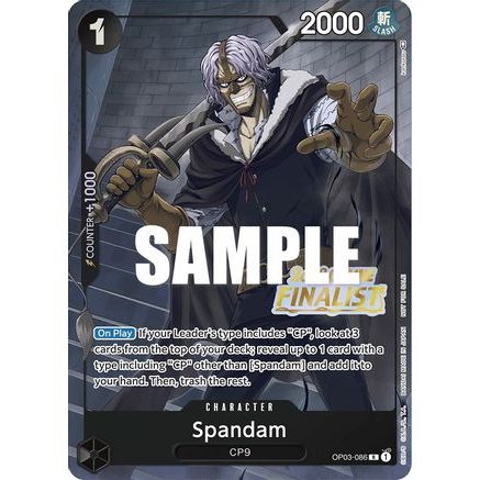 [On Play] If your Leader's type includes "CP", look at 3 cards from the top of your deck; reveal up to 1 card with a type including "CP" other than [Spandam] and add it to your hand. Then, trash the rest.