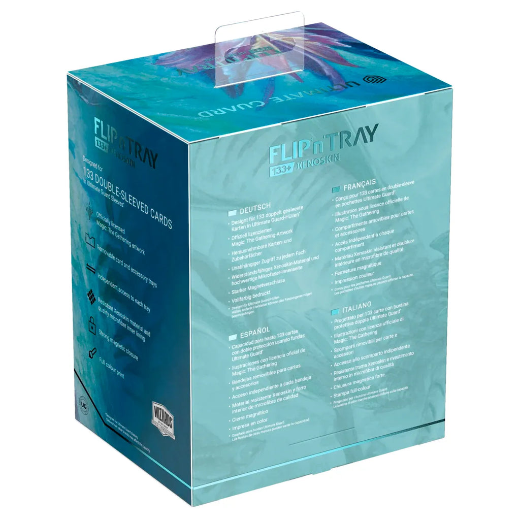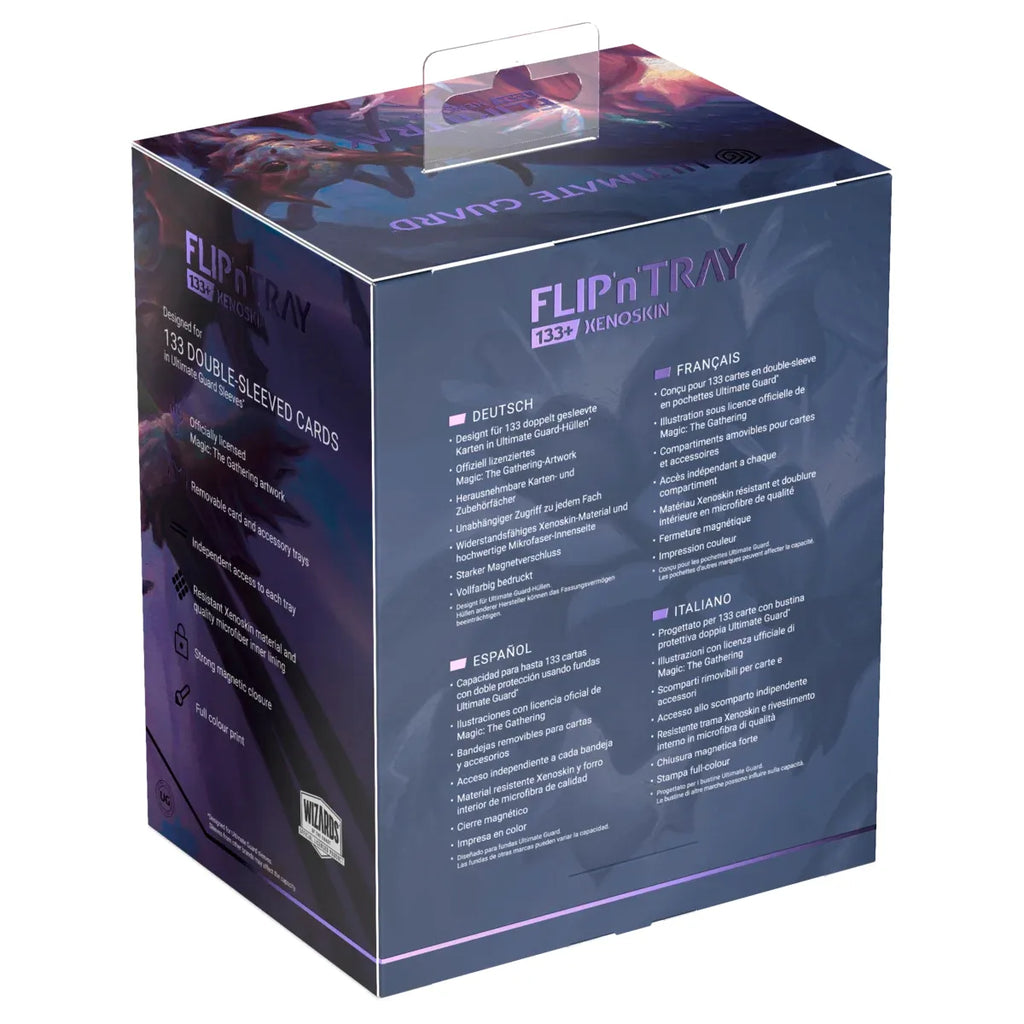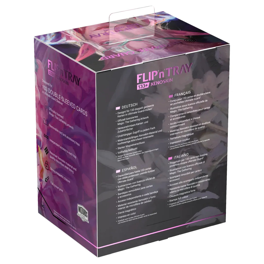 The Flip'n'Tray 133+ Xenoskin is a high-quality TCG deck box that offers premium card protection thanks to its resistant Xenoskin material, microfiber inner lining, and strong magnetic closure. The deck box has an integrated and removable accessory tray for dice that can be accessed independently and is printed in full color with officially licensed artworks from Magic: The Gathering’s upcoming set "Lorwyn Eclipsed". The Flip’n’Tray 133+ Xenoskin is optimized to hold 133 double-sleeved or 160 single-sleeved cards in Ultimate Guard sleeves.