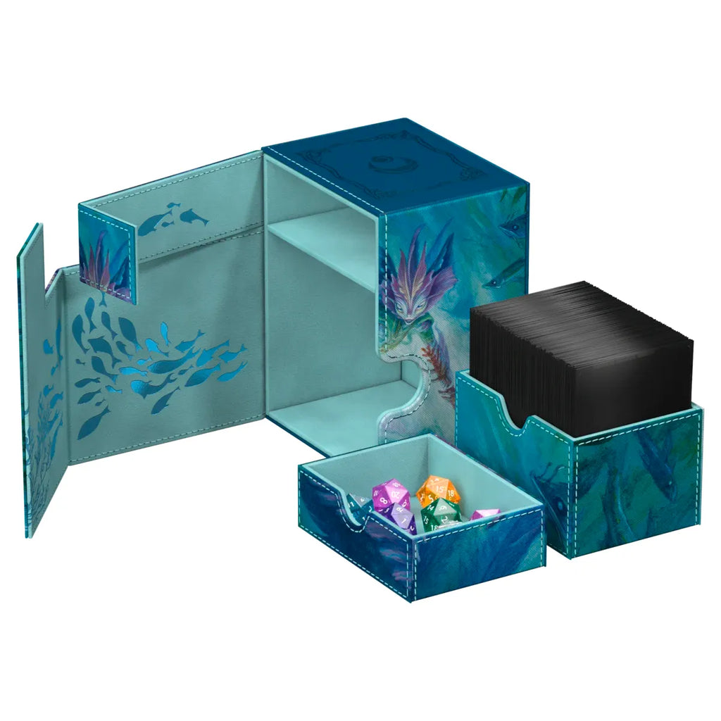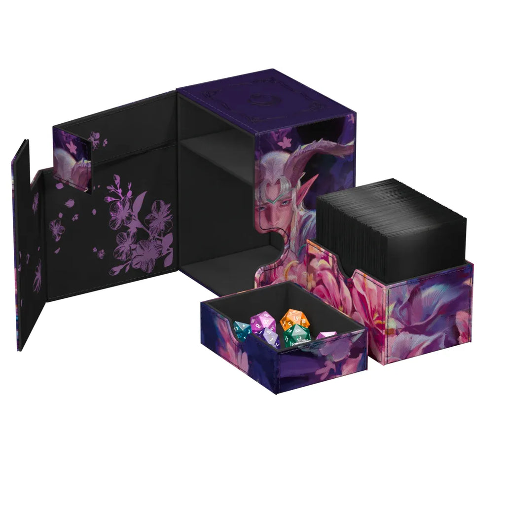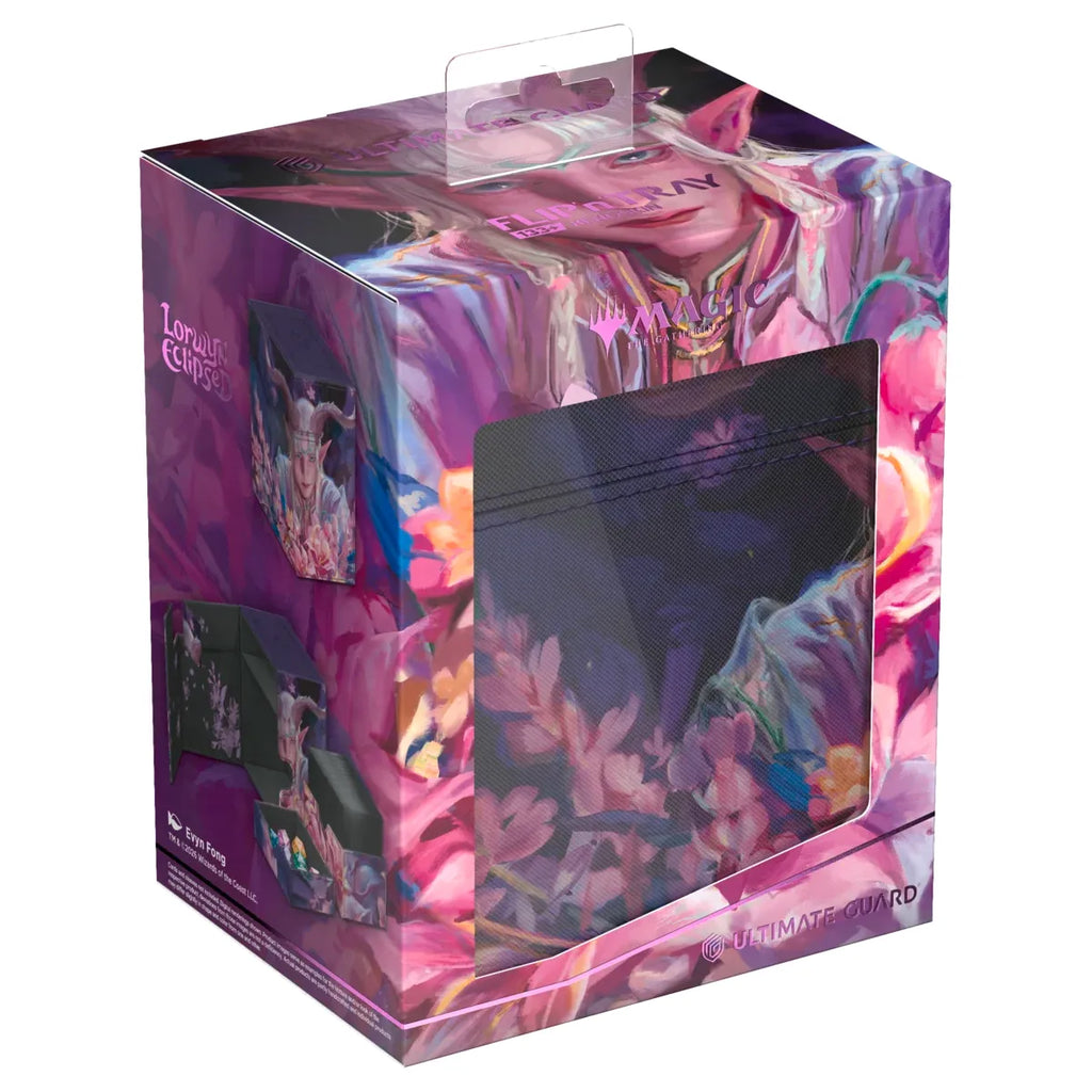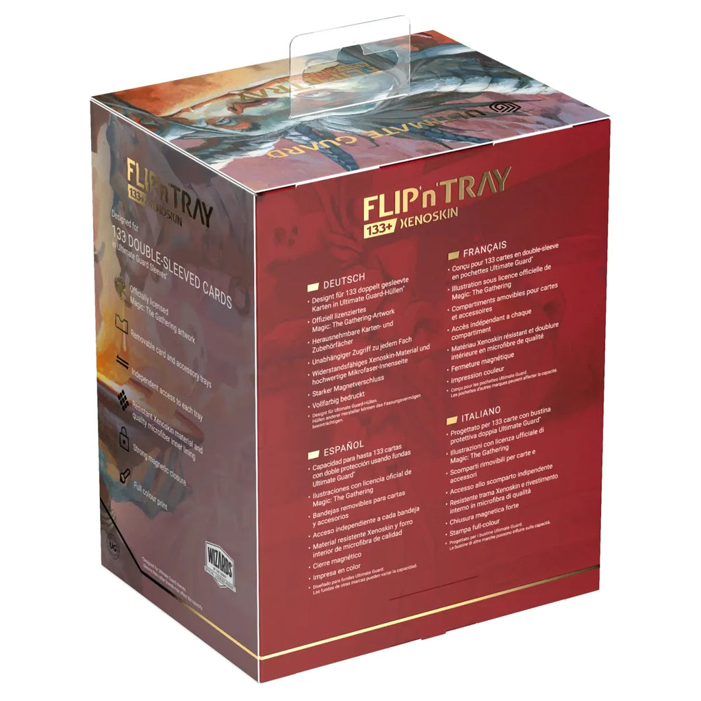 The Flip'n'Tray 133+ Xenoskin is a high-quality TCG deck box that offers premium card protection thanks to its resistant Xenoskin material, microfiber inner lining, and strong magnetic closure. The deck box has an integrated and removable accessory tray for dice that can be accessed independently and is printed in full color with officially licensed artworks from Magic: The Gathering’s upcoming set "Lorwyn Eclipsed". The Flip’n’Tray 133+ Xenoskin is optimized to hold 133 double-sleeved or 160 single-sleeved cards in Ultimate Guard sleeves.