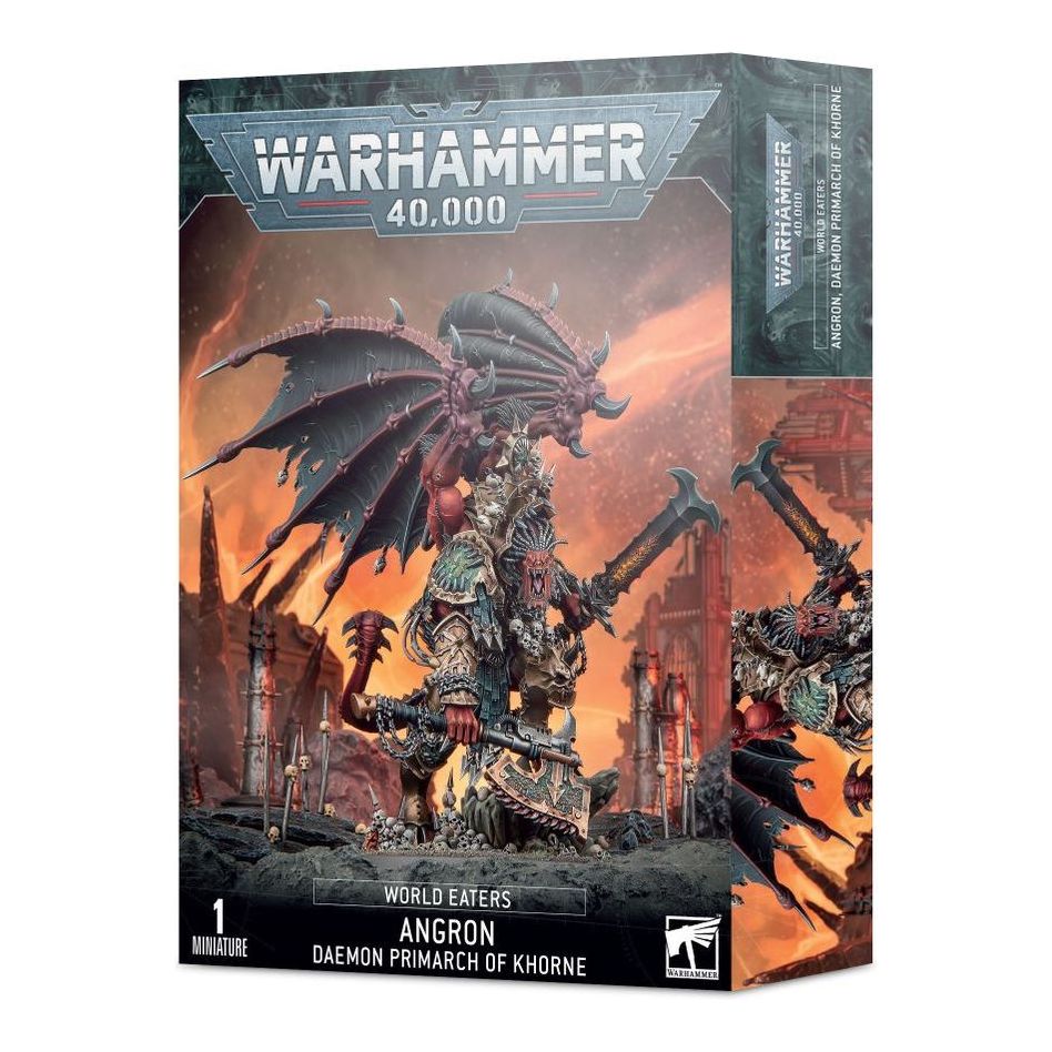 Angron is the Red Angel, Lord of the World Eaters, the Daemon Primarch of Khorne. Raised as a slave in the brutal fighting pits of Nuceria, this maddened demigod sought glorious death in the battles of the Horus Heresy – only to be damned to an eternity of undying rage. For ten thousand years he has savaged the Imperium, fury given immortal form, the butchers of the XII Legion following in his bloody wake. When he steps forth into realspace, Angron is an unstoppable engine of destruction with the strength to tear apart bastions with his bare hands and stop Titans in their tracks. His very presence drives those around him into a frenzy of wrath and fear, as he carves his way through entire armies in a whirlwind of apocalyptic bloodshed.