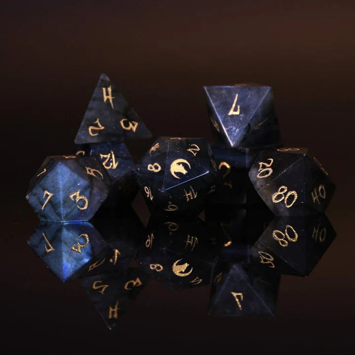 Each die is hand carved from pure gemstone and polished in a proper tumbler. Designs are then engraved into each side and hand painted. Gemstone dice are never guaranteed to have a perfectly balanced weight; however, each of our dice sets are always well weighted and well balanced.