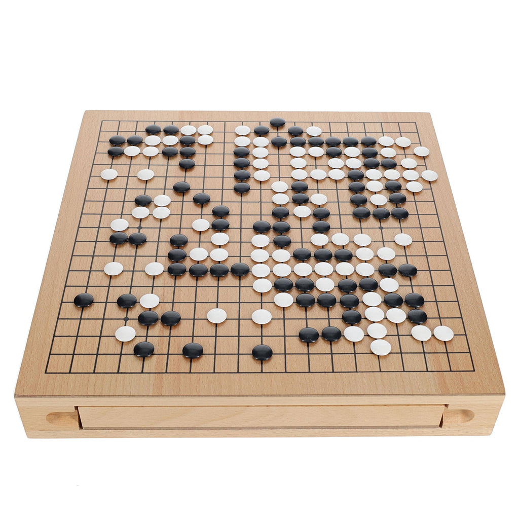 This Go board is made from high quality wood veneer to match the golden-tinged Kaya tree of which the very best Gobans are made. The board size does not require a large space on which to play. The surface features 19 horizontal and 19 vertical lines that form 361 points of intersection with 324 squares. Storage drawers are included on both ends for storing the white and black stones. No go bowls are needed. Simply remove the stones from the drawer during play. When not in use, the drawers recess neatly into the game. The sleek design makes this Go game a perfect decorative piece that will attract players when left out as a coffee table center piece.